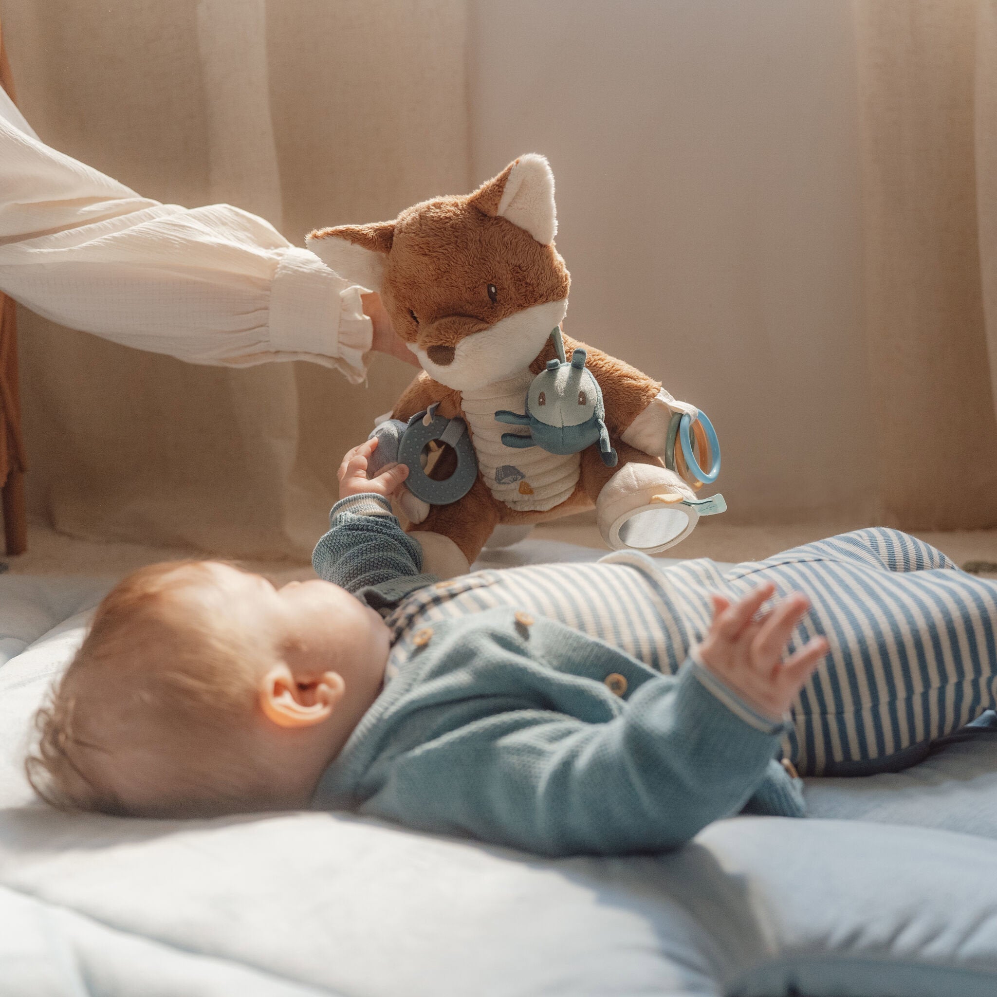 Dieses liebevolle Kuscheltier lädt nicht nur zum Schmusen ein, sondern hat viele kleine Entdeckungsmomente parat: rasselndes Geräusch, ein knisternder Käfer auf der Schulter, allerlei Anhänger wie Eichel und Pilz zum Greifen, Ringe an der Pfote sowie ein kleiner Spiegel unter dem Fuß. All diese liebevollen Details regen die Neugier Ihres Babys an — und nach einem aktiven Spiel- und Entdeckungsabend träumt es sanft von einem zauberhaften Wald voller treuer Freunde